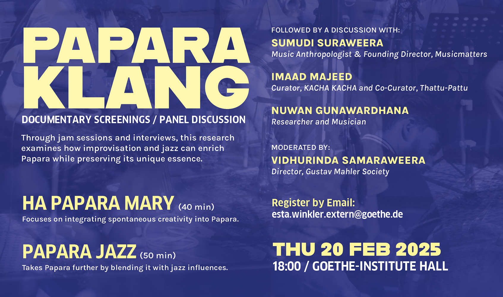 In 2025, Nuwan partnered with the Goethe-Institut Colombo to host Papara Klang, a public platform for conversation on Papara. The event included screenings of his documentaries on “Ha Papara Mary” and “Papara Jazz”, followed by an open discussion with musicians, scholars, and cultural stakeholders. The discussion was dynamic, sometimes heated, but always constructive. It revealed the depth of feeling around Papara — from traditionalists wary of change, to innovators excited about globalizing the genre.